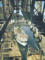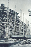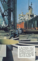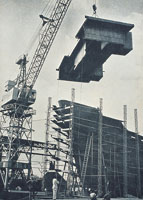 圖示一家船塢內,工人正利用吊臂將整個船艙組件移嵌在一隻六千五百噸的貨船上。