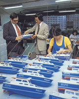 圖中一家澳洲玩具公司的總經理,正在香港一間最大和最現代化的玩具廠,玩賞一艘電動小艇。
