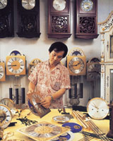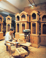 這間屯門工廠專門生產古雅的人手油漆雕花壁鐘,鐘殼以花梨木或柚木製成。