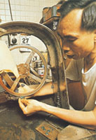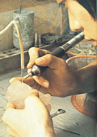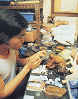 | 雕刻匠在一塊孔雀石上劃出所需圖形,然後進行琢磨成為項鍊的一部份。桌上滿佈各類名貴寶石。 |