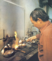 一位工匠正小心翼翼,將溶金倒入鑄模內,製成重五兩的金塊。