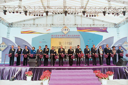 廠商會會長陳永棋(左七)、全國政協副主席霍英東(右八)、香港特區行政長官董建華(左八)、中央駐港聯絡辦公室主任姜恩柱(左六)、中國外交部駐港特派員吉佩定(右六)、第三十六屆工展會執行委員會主席楊孫西(右七)、永遠名譽會長梁欽榮(左五)、名譽會長周忠繼(右五)、黃保欣(左三)、葉慶忠(右三)及周亦卿(左一)主持工展會開幕剪綵儀式。 |