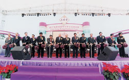 廠商會會長陳永棋(左六),香港特區行政長官董建華(左七),全國政協副主席霍英東(右七),工展會執行委員會主席楊孫西常務會董(右六),中央駐港聯絡辦公室主任高祀仁(左五),中國外交部駐港特派員吉佩定(右五),工商及科技局局長唐英年(左三),經濟發展及勞工局局長葉澍?(右三),威馬企業有限公司董事長蔡龍威(右二),永遠名譽會長梁欽榮(左四),名譽會長黃保欣(右四)、葉慶忠(左二)、蘇包陪慶(右一)及周亦卿(左一)主持第三十七屆工展會開幕剪綵儀式。