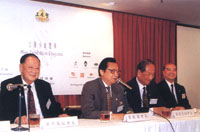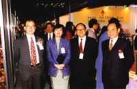 廠商會會長梁欽榮(左二)主持一九九四年十月二十日舉行之第三十二屆工展會工展小姐選舉記者招待會。