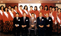 工展小姐候選佳麗初次與新聞界會面,並於會後與廠商會會長梁欽榮(前排中):副會梁乃榮(前排左二)、葉慶忠(前排右二);會董盧文端(前排左)及馮元侃(前排右)合照。