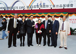 廠商會會長梁欽榮(左三)於第三十三屆工展會頒贈一枚名貴珍珠鑽戒予第六十萬名幸運入場人士余曾玉蓮女士(中)。